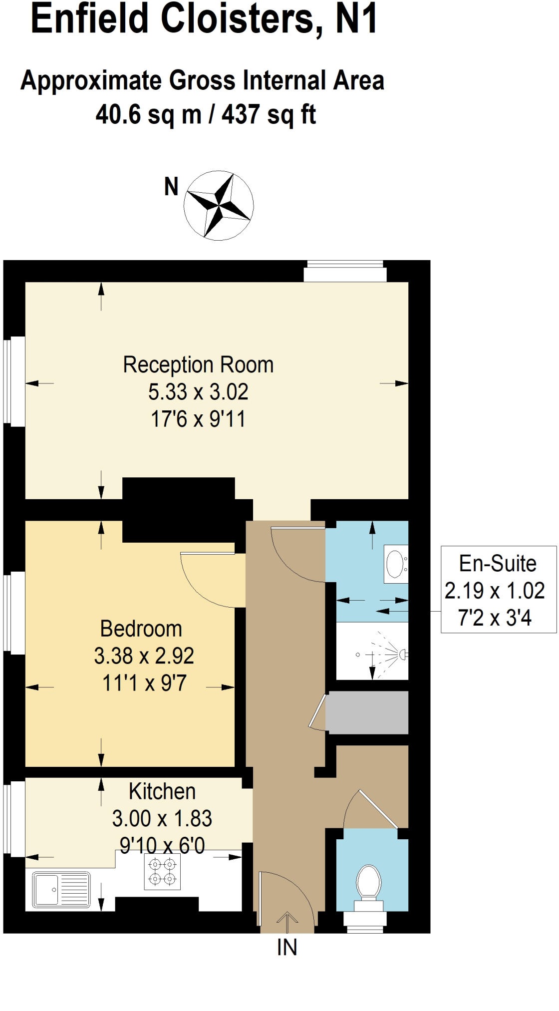Extending to approximately 437 sq ft 40.6 sq m, the property offers a bright reception room measuring 17'6 x 9'11, a separate fitted kitchen, a double bedroom, en suite shower room and an additional guest WC. The layout is practical and well proportioned, making it suitable for both owner occupiers and investors.