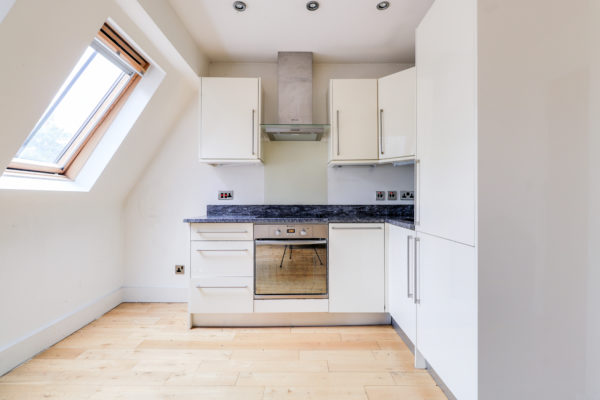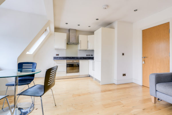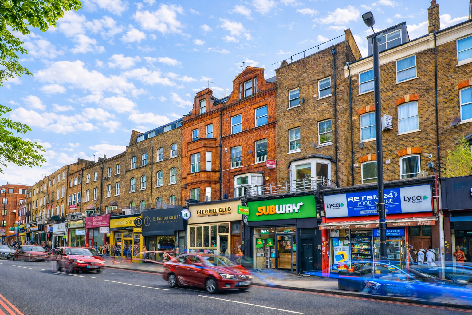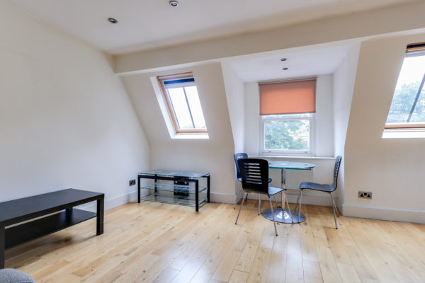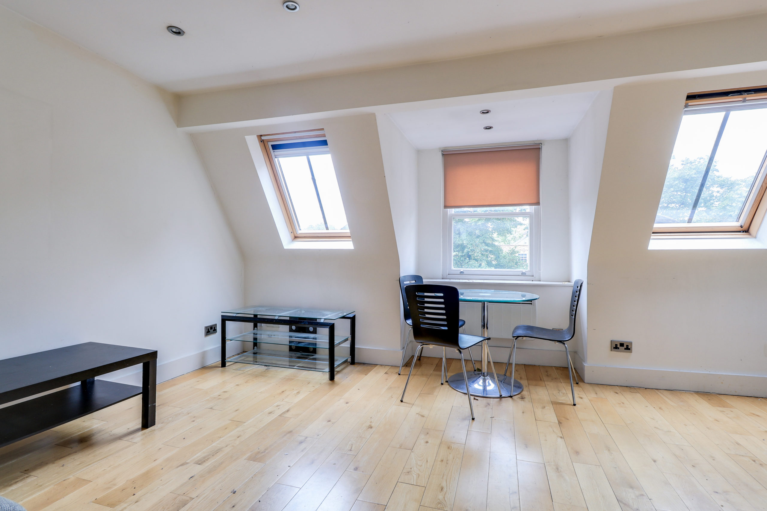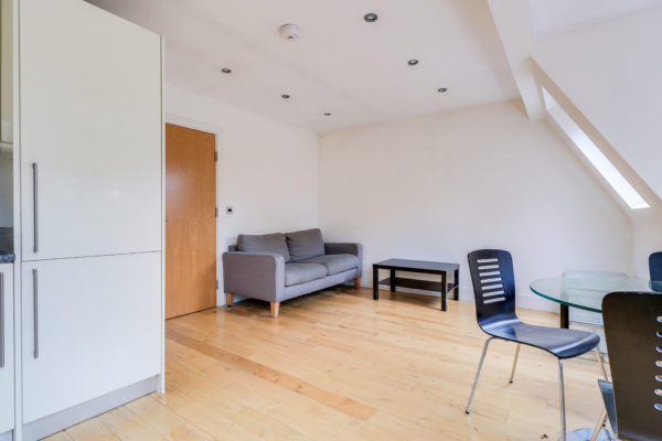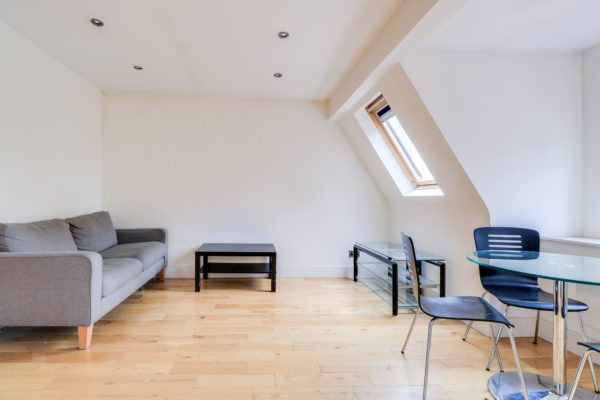 Top floor one bedroom flat on Upper Street with open plan reception, wood flooring, fully fitted kitchen, double bedroom with storage, and spacious bathroom.