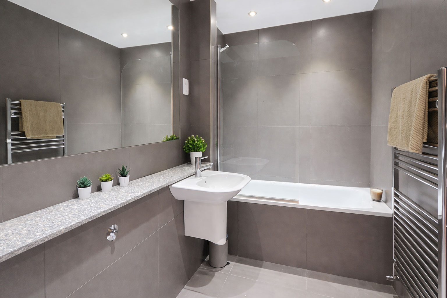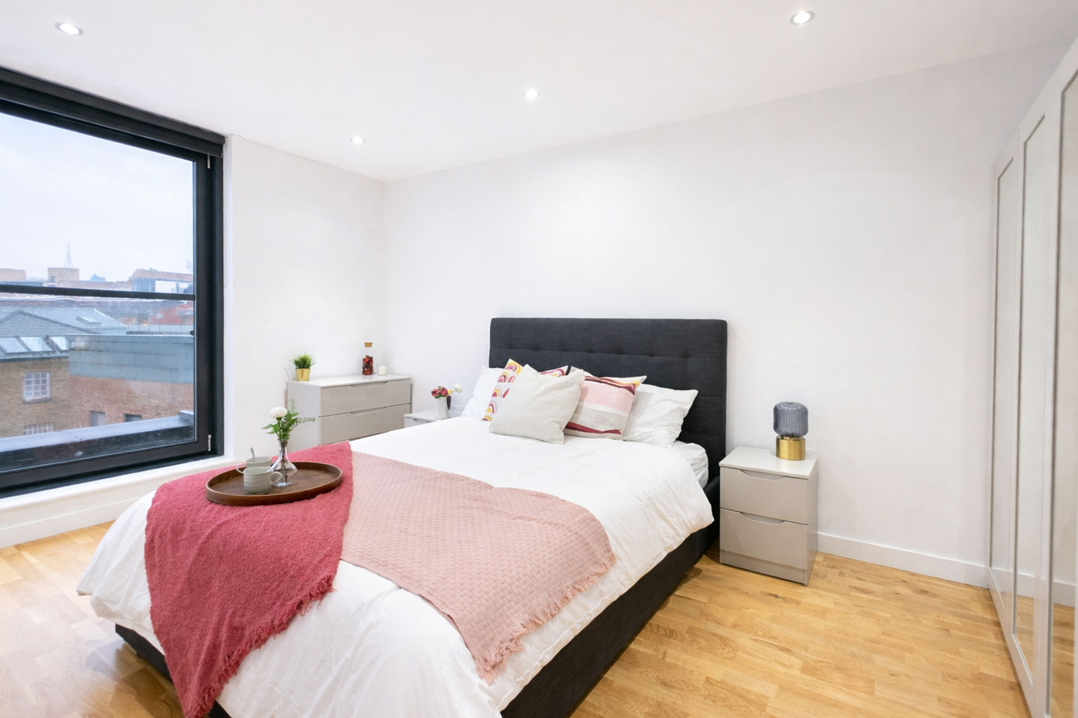 The double bedroom is well-proportioned and complemented by a sleek, modern bathroom finished with high-quality fixtures. With wood flooring throughout, excellent ceiling height, and floor-to-ceiling glazing in key areas, the flat offers both comfort and aesthetic appeal.