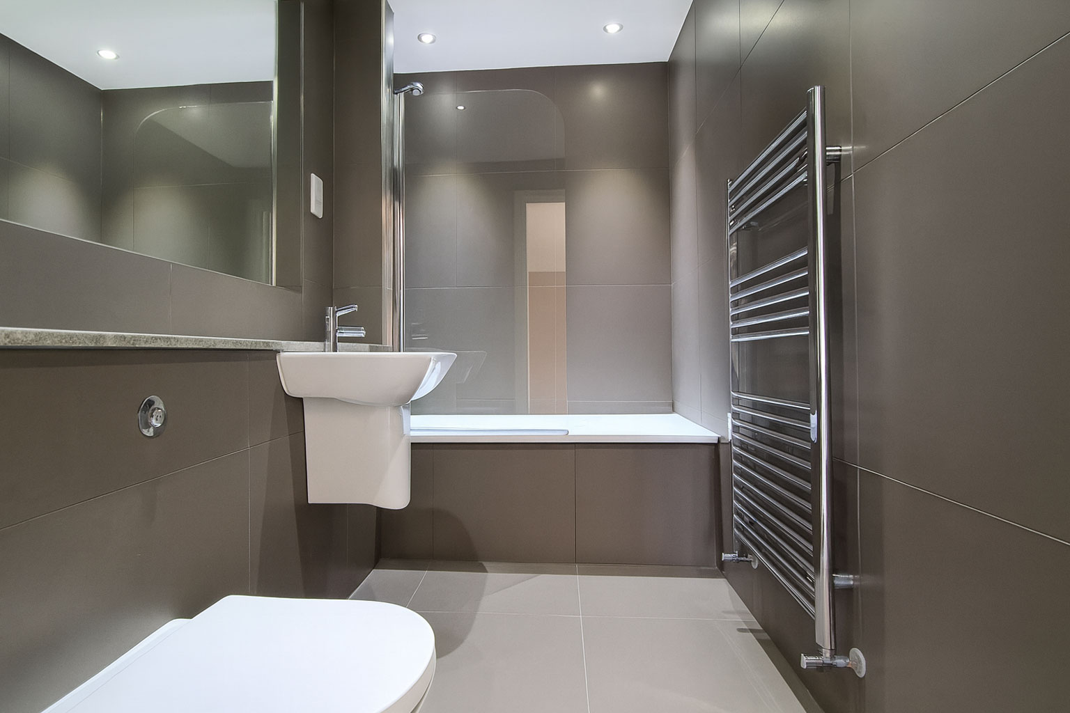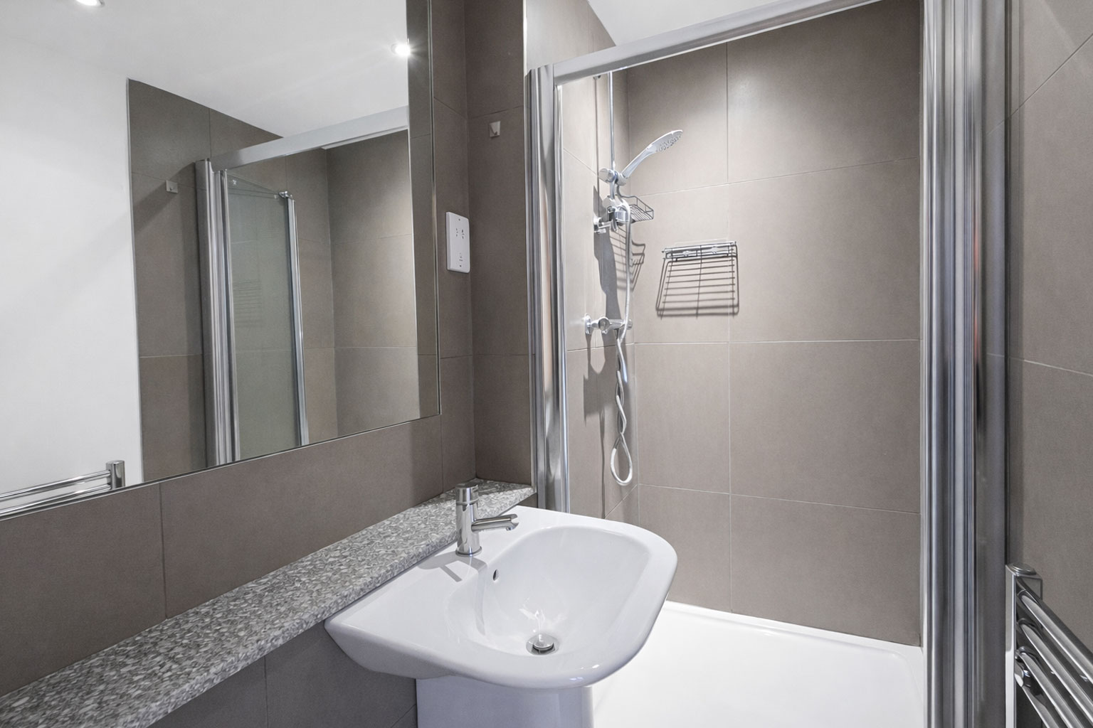 The apartment offers two well-sized double bedrooms, with the principal benefitting from an en-suite shower room. A second guest bathroom is finished to a high specification. The fully fitted modern kitchen includes integrated appliances and sleek cabinetry.